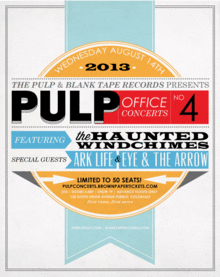 PULP magazine and Blank Tape Records have teamed up to give you a special concert! on Wednesday August 14th, PULP Office Concerts will continue with concert #4; featuring local troubadours The Haunted Windchimes as well as some of Denver's latest and greatest, Ark Life and Eye & The Arrow