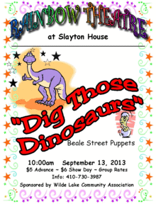 Rainbow Theatre at Slayton House will begin this season's series with the ever popular Beale Street Puppets performing "Dig Those Dinosaurs" on Friday, September 13, 2013. The past is alive with prehistoric performers! Our extinct entertainers, Elvis Saurus and Ted Pterodactyl join the Fossil Follies. Don't miss our madcap marionettes' Ice Age Antics! The puppet show is at 10:00am in the Slayton House Theatre in the Village of Wilde Lake in Columbia. Tickets may be purchased in advance for $5 each and may be available at the door for $6 each; exact cash or check only, no credit cards, no reservations and no refunds.