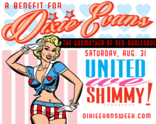 Dixie Evans, the "Marilyn Monroe of Burlesque", is the beloved Godmother of the new burlesque movement. During her birth week (August 26th through September 1st), performers and burlesque instructors from all over the world are hosting events, shows and classes to raise money for this burlesque legend and founder of The Miss Exotic World Pageant.