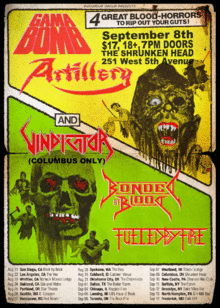 Gamma Bomb (Northern Ireland) Artillery (Danmark) Bonded by Blood (California) Fueled by Fire (California) Vindicator (Ohio) Doors: 7PM Age: 18+ Parking: Free on lot and street