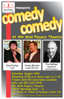 It's time to get'r'done and get some laughter started in Puyallup! The 4th Wall Players first ever (Part Deux) Stand-up Comedy Night is all set for Aug. 24th at 8:00. We're featuring the comic styling's of Dan Farley, Jonas Barnes and Hypnotist Jim Kellner. Come to the 4th and experience Puyallup's newest comedy venue. Located at 152nd and Meridian next to Key Bank, its comedy in an intimate 75 seat venue. Beer and wine available and come ready to laugh!