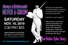 Robin Tylers one woman multi-media comedy play Always a Bridesmaid, Never a Groom met with rave reviews during its run at the Diversionary Theatre.