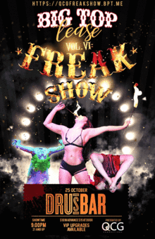 They say that the freaks come out at night, so Join us for an evening filled with circus acts, burlesque, drag and more! We will have special performances from out of town guests, giveaways and more! QCG Productions is back at Drus Place for their monthly variety show, but this time, things are going to be a little more freaky!