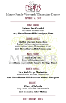 Join Emory's on Silver Lake as we partner with Mercer Family Vineyards for our Winemaker Dinner on October 16th! This Chef prepared 5-course dinner will begin at 6pm.