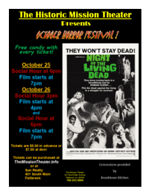 Valid for one showing of "Night of the Living Dead" on Friday, October 25th at 7PM or Saturday October 26th at 7PM. Free candy with every ticket!