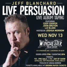 Comedian Jeff Blanchard records his newest Album "Live Persuasion" in front of a Live audience at The Winchester Music Club (12112 Madison Ave Lakewood, Ohio.) Local support artists include Cody Cooper, Liz Blanc, and John Bruton. Hosted by Joshua Morrow
