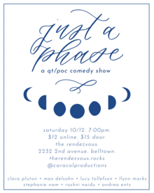 Come laugh and celebrate the voices of LGBTQIA+ people and people of color in this stand-up comedy showcase. JUST A PHASE is a monthly showcase that aims to highlight the stories and talents of underrepresented people in comedy.