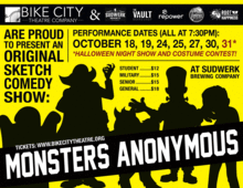 The air is changing; there's a familiar crispness that signifies the coming of Autumn, and with it, Bike City Theatre's Halloween Sketch show: MONSTERS ANONYMOUS. Yes, the spookying will intensify, the beer will flow, and the laughs will come IN ABUNDANCE.
