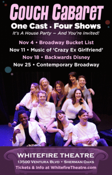 You know that feeling of being at a house party that devolves into some of the best and most memorable karaoke performances of your life? Now, think of that with professionals. Join Whitefire Theatre for our "Couch Cabaret" series filled with hilarity, love and Broadway dreams. We welcome you into our artistic living room where each week the same cast of players will embark on an ENTIRELY new musical journey. Each night is a ONE-NIGHT only performance--so you don't want to miss even one of them! Classics will be visited, favorites will be re-imagined, memories will be made. Come and join our theatrical house party for FOUR nights of musical fun!