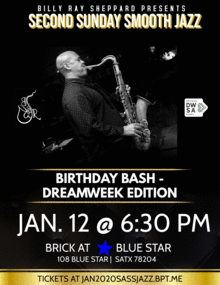 BillyRay Sheppard and some of the area's finest musicians come together to bring Second Sunday Smooth Jazz to Brick at Blue Star in Southtown. This party with a purpose celebrates his birthday and DreamWeek. An all-out jam session with BillyRay's long time musician friends playing all genres of music guarantees for a night of fun, food and energy. This year's event will benefit the San Antonio African American Community Fund of the San Antonio Area Foundation.
