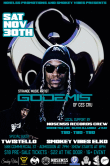 No1elss Promotions and Smokey Vibes Elko are bringing for the first time to Elko Strange Music Inc Artist GODEMIS of CES CRU/ Tech9ne record label. And as a special guest TWISTELLO from Buffalo NY. Comprised of emcees Godemis and Ubiquitous, 2012 Strange Music signees CES Cru have been supplying staunch hip-hop purists with the no-nonsense bars they desperately seek. In their multiple national tours and steady stream of remarkable releases, CES has garnered a reputation for mind-bending wordplay and intricate lyrical tag-teaming. CES Crus 2017 project, Catastrophic Event Specialists, builds on the duos trademark political commentary and cutting flows. On the standout album, the pair turned a critical lens on todays tumultuous political and musical climate, their go-for-the-throat style perfect for delivering such a scathing breakdown. CES Cru continues to refine their proven formula, each bar more focused than the last, making an already dangerous duo even more formidable.