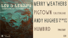 Merry Weathers will be celebrating their 8th band-iversary with musical friends Pigtown Fling String Band, Humbird, and Andy Hughes & the Mighty Few at Leo & Leona's! Come on out to celebrate and kick off your Thanksgiving weekend on Wednesday. Bring 'yer dancing shoes and drinking boots!