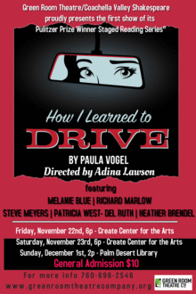 Six of the Coachella Valleys finest actors present a staged reading of Paula Vogels award winning- play, How I Learned to Drive. Winner of the 1998 Pulitzer Prize for Drama, How I Learned to Drive chronicles the story of a teenage girl, Lil Bit, and her complicated sexual relationship with the husband of her aunt, Uncle Peck. The association that began in Lil Bits pre-adolescence continues through her teenage years and the start of college. Using driving lessons as a metaphor, Playwright Paula Vogel somehow manages to weave dark humor and even tenderness amidst the disturbing motifs of pedophilia, incest, and the precarious status of women and girls.
