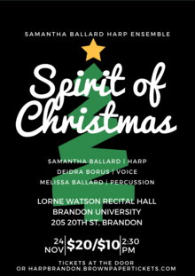 The Samantha Ballard Harp Ensemble is coming to Brandon this year, celebrating the Christmas season with their original arrangements for harp, voice, and percussion that will take away your worries and cares and fill you with Christmas Spirit. With a program of traditional Christmas favourites and maybe even a few you haven't heard before, this will be the perfect concert to kick off the holiday season.