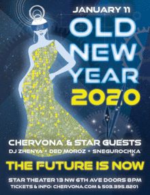 Dear friends, we are happy to announce Chervona's Signature Party - 14th annual Old New Year Celebration - 2020 -The Future Is Now, on Sat Jan 11h, 2020 at Star Theater Portland! This year we have a very significant motif to celebrate the forthcoming of long-awaited almost sci-fy future that is becoming our new reality. The futuristic theme will be highlighted throughout the night. The best futuristic costume will get the main prize of the audience costume contest.