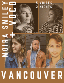 In March, 2020, Moira Smiley's vocal quintet, VOCO brings together five wildly gifted singers and song leaders from across North America to sing and stomp together - a cappella! Grounding VOCO's signature female harmony are two virtuoso male singers, and all together they lift up Moira's soulful, joyous original songs and a delicious selection of ancient folk songs.