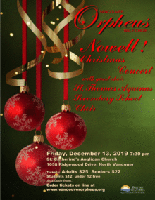 The very popular Vancouver Orpheus Male Choir and guests St. Thomas Aquinas Secondary School Choir present a concert celebrating the Christmas season. Our repertoire spans diverse musical genres from Classical to Pop and Jazz; from familiar Christmas carols to seldom heard seasonal songs from the past.