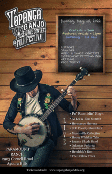 For the complete lineup on all 3 stages, visit our website @topangabanjofiddle.org. Live Americana, Bluegrass, Folkloric, Old-Time Music; Jamming Areas, Musical Instrument Vendors; Performance Contests and Folk Dancing Competition for all ages; Instrument Petting Zoo for Kids, Artisan Wares, Great Food. Topanga BanjoFiddle Contest and Folk Festival 2022