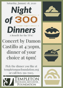 Start your evening off with a concert by Damon Castillo at 4:30 at the Templeton Performing Arts Center. Following the concert, you will attend the dinner of your choice.