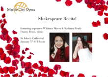 Join Marble City Opera Executive Director, Kathryn Frady and international soprano, Whitney Myers for a recital of art songs, arias, and monologues using Shakespeare's characters and/or texts.