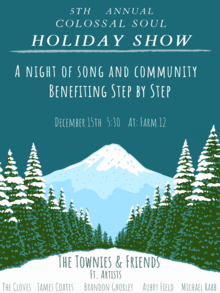*Dinner Info Update: Come at 5:30pm to warm up with a cup of Farm 12 house made soups and grilled cheese, sweet treats, and a coco and cider bar before the concert kicks off at 7pm. All proceeds benefit Step by Step. Cash and Credit Accepted.