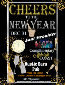 Ring in the New Year with Soul Provider at The Rustic Barn! Soul Provider is an 8 piece horn fueled band playing rock/ R&B.