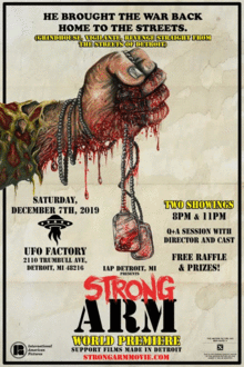 December 7th, 2019 Independent American Pictures will hold two public screenings of the movie STRONG ARM December 7th, 2019 @8pm and 11pm at The UFO FACTORY in Detroit, MI located at 2110 Trumbull Ave. 48216....Tickets are $5 Dollars and can be purchased in advance at ufofactory.com or also at the door the day of the of the premiere.