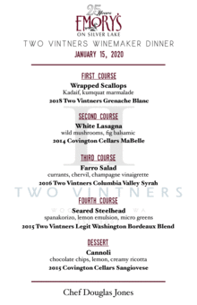 Join Emory's on Silver Lake as we partner with Two Vintners Winery/Covington Cellars for our Winemaker Dinner on January 15th! This Chef prepared 5-course dinner will begin at 6pm.