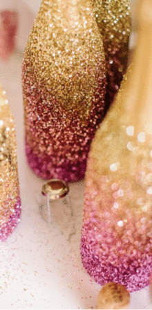 (3) hand-glittered bottles of champagne, Elderflower liqueur, OJ, Grapefruit Juice, fresh blackberries + blueberries.