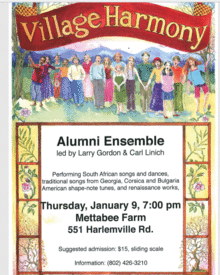 Village Harmony is an organization dedicated to the study, teaching and performance of harmony singing traditions from across the world, and sponsors an extensive program of travleing singing camps both in New England and abroad. The young alumni singers, ages 19-26 are all veterans of many years of these Village Harmony programs, including overseas tours in South Africa, Macedonia and Georgia.