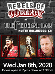 It's Rebels of Comedy at the Federal Bar in North Hollywood. Come out and see a night of live comedy, featuring an awesome lineup of professional features and headliner comedians.
