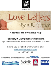 Just in time for Valentine's Day Live Bait Theatre will present A. R. Gurneys award winning play, Love Letters. The play will be presented at the historic Marshlands Inn in Sackville, and light refreshments and drinks will be available for purchase at the performance.