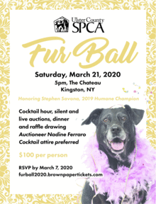 Join us for our 2020 Fur Ball, the Ulster County SPCA's annual gala! The evening includes cocktails and hor d'ouerves, silent auction and raffle, and dinner. Hosted at the beautiful Chateau in Kingston, NY.