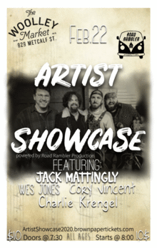 The Woolley Market Artist showcase, Featuring: Jack Mattingly, Wes Jones, Cory Vincent, & last but not least guitar extraordinaire Charlie Krengel.
