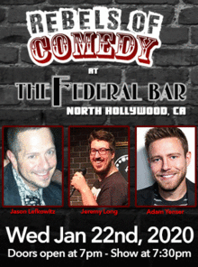 It's Rebels of Comedy at the Federal Bar in North Hollywood. Come out and see a night of live comedy, featuring an awesome lineup of professional features and headliner comedians.