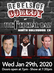 It's Rebels of Comedy at the Federal Bar in North Hollywood. Come out and see a night of live comedy, featuring an awesome lineup of professional features and headliner comedians.