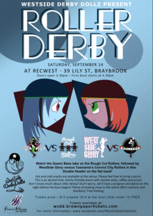 Are you ready for the follow up to our first Home Bout? And it's a Double Header so you get double the fun! At the pointy end of the 2013 Vic/Tas Tournament WestSide Glory will go head to head with Tasmania's Convict City Rollers, while the Queen Bees take on the Rough Cut Rollers. Doors open at 3:30pm, and the first bout kicks off at 4.30 Bout 1 - 4:30pm: VRDL Queens Bees vs DVRDC Rough Cut Rollers Bout 2 - Approx 6:30pm: WSDD WestSide Glory vs CCRDL Convict City Rollers