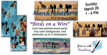 Cool new painted wood party! Any color background, and optionally up to 5 clothespins. Use it to hang pictures, or create a beautiful wood painting of birds on a wire. Stencils available! Janeen will provide all the supplies and direction needed. Her paint parties are very well liked and attended, so be sure to purchase your tickets soon. $30 per person. Come early for lunch. Seating is limited, and pre-paid reservations are required. See you at the winery!