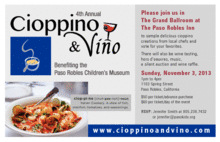 Please join us for our 4th annual Cioppino and Vino Fundraiser at The Historic Paso Robles Inn. Sunday, November 3rd, 2013 from 1:00pm to 4:00pm. Come sample delicious Cioppino creations from 10 to 12 local chefs, like Thomas Hill Organics and Jeffery's Catering, and vote for your favorite. We will also have a panel of judges, including Pepper Daniels from The KRUSH, casting their votes. 15 of our local wineries will be on hand to pour their latest varietals and blends, including Tables Creek, Epoch and Eberle to name a few. We will have live music, silent and live auctions and a lot of FUN! Tickets are $50 per person in advance or $60 at the door (if we don't sell out) $500 for a VIP table for eight.