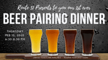 Route 51 Brewing Company will be hosting our first ever Beer Pairing Dinner. This dinner will include 5 of our very own brewed Route 51 Beers and will be paired with five courses prepared by our very own chef Seth Jumps. Tickets are $40+tax+gratuity