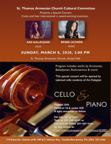 Cellist Ani Kalayjian & Pianist Reiko Uchida in concert at St. Thomas Armenian Church on Sunday, March 8, 2020 at 2 p.m.