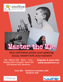 Wordstorm presents Master the Mic, a workshop for anyone who gives public presentations, readings, or performances; emcees events; or just wants to sound better and gain confidence when using a microphone. Learn about various types of microphones and when to use different kinds, develop breath control, and practice clear speaking techniques. There will be lots of practice time and individual coaching during the workshop.
