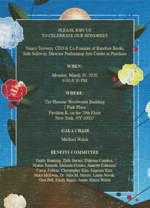 Benefit Committee: Sebastian Arcelus, Emily Bunning, Zafir Buraei, Dahiana Candrea, Matias Einaudi & Melanie Gomez, Annette Eskenazi, Carrie Fellens, Christopher Kim, Eugenia Kim, Mara McEwin, Dr. Julia M. Morris, Linda Novak, Geri Pell, Emily Regas, and Annie Mayer Walsh