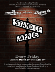 A classic Stand Up Comedy showcase featuring 5 of the best of KC's sizzling comedy scene. Join us at the Groundhog Day Theatre, the funkiest venue in the KC Northland for an evening of fun and big laughs. This week features: Ty Clay, Josh Shirley, Mick Rice Hall, Eric Vallier, and headliner Dale Hilton. Your host and emcee, Rod Reyes.