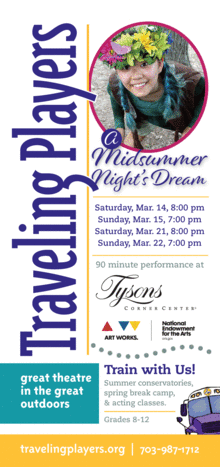 Traveling Players presents A Midsummer Nights Dream, one of the bards most iconic comedies. The play follows four young lovers who evade parental rule and city law by escaping into the forest, only to be transformed by mischievous fairies. Reality and illusion interchange in the woods, as do love and hate, clarity and confusion. As the tricks are reversed and the couples reunite, we delight in their wedding entertainment provided by a set of bumbling actors.