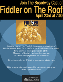 Join us for a special evening with the cast of the Broadway show Fiddler on the Roof, as they sing, dance and explain how a limited run at the Museum of Jewish Heritage, turned into an 18-month adventure, moving uptown to Stage 42. Fiddler on the Roof, or A Fidler afn Dakh, is based on a series of stories written by Sholem Aleichem in Yiddish. Life in this little Jewish settlement named Anatevka, in Imperial Russia, would have had its community speaking in Yiddish, which is what made this revival so special.