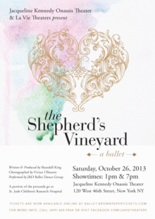 Set in 970 BC in Western Asia, The Shepherds Vineyard is a compelling love story of one king's secret passion for a peasant shepherd girl from the garden of En Gedi. This beautiful yet tragic love story is set to dance by choreographer Vivian Ullman and the Jacqueline Kennedy Onassis Dance Troupe. Written and produced by Producer/Composer Shandell King , this is a ballet you don't want to miss.