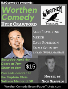Nick Giasullo, a UML graduate and long time supporter of the 5k, is bringing in some talented comics to accompany your headliner, Kyle Crawford! Kyle has been headlining clubs all over New England for a long time! Come see for yourself and support a great cause in the process! All you gotta do is get tickets and show up for a great time!