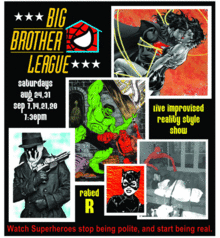 Come and see The Unscriptables present their unique take on the competitive reality show format in Big Brother League. This is an episodic show, with the heroes trying to collect points in order to win the grand prize. The story is shaped by audience suggestions, and audience votes will ultimately determine who is crowned champion. In order to get the whole story of Big Brother League, you should try and make all of the shows. However, this production is designed to be enjoyable no matter where you start and end. The talented performers of The Unscriptables know how to put on a show, portraying heroes you thought you knew in fresh and surprising new ways.