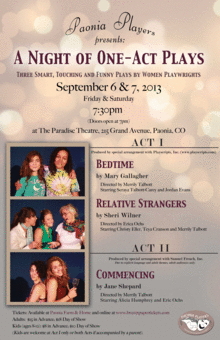 Three smart, touchy and funny plays by women playwrights. Act One includes two plays: Bedtime by Mary Gallagher, starring Jordan Evans and Seraya Talbott-Carey and Relative Strangers by Sheri Wilner, starring Teya Cranson, Christy Eller and Merrily Talbott. Act Two is the play Commencing, by Jane Shepard, starring Alicia Humphrey and Erica Ochs. Due to explicit language and sexual themes, this play is for adult audiences only.